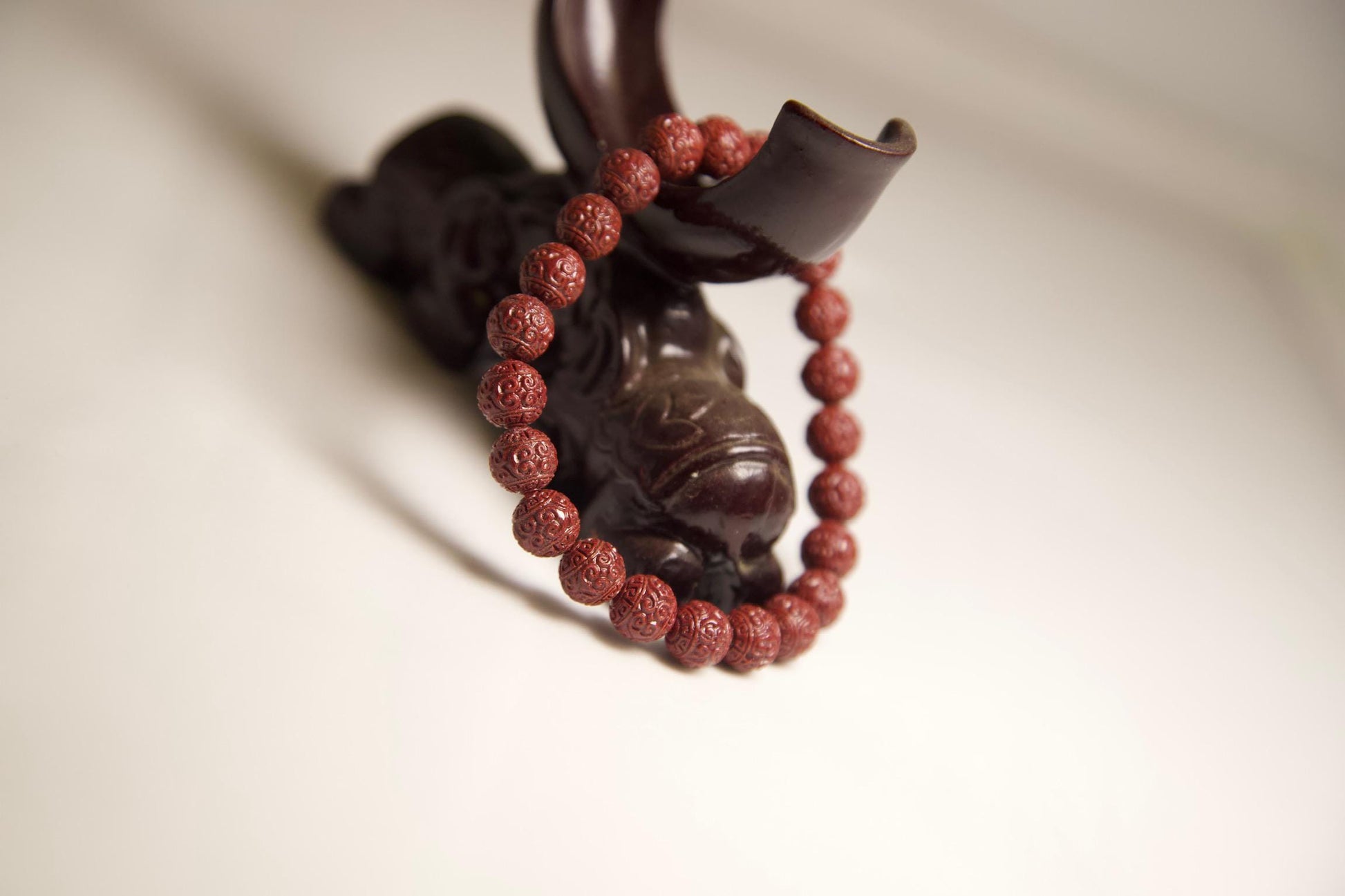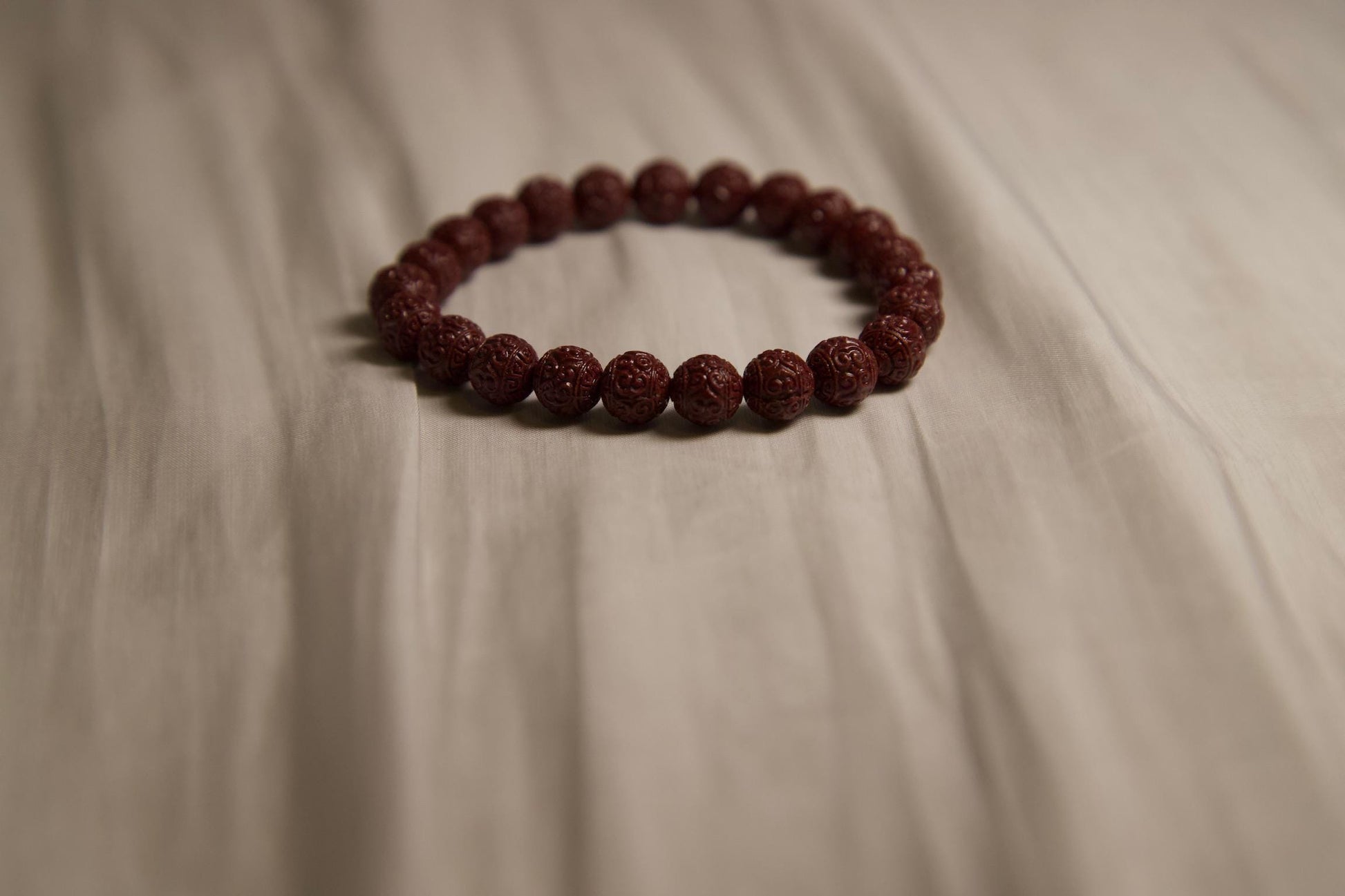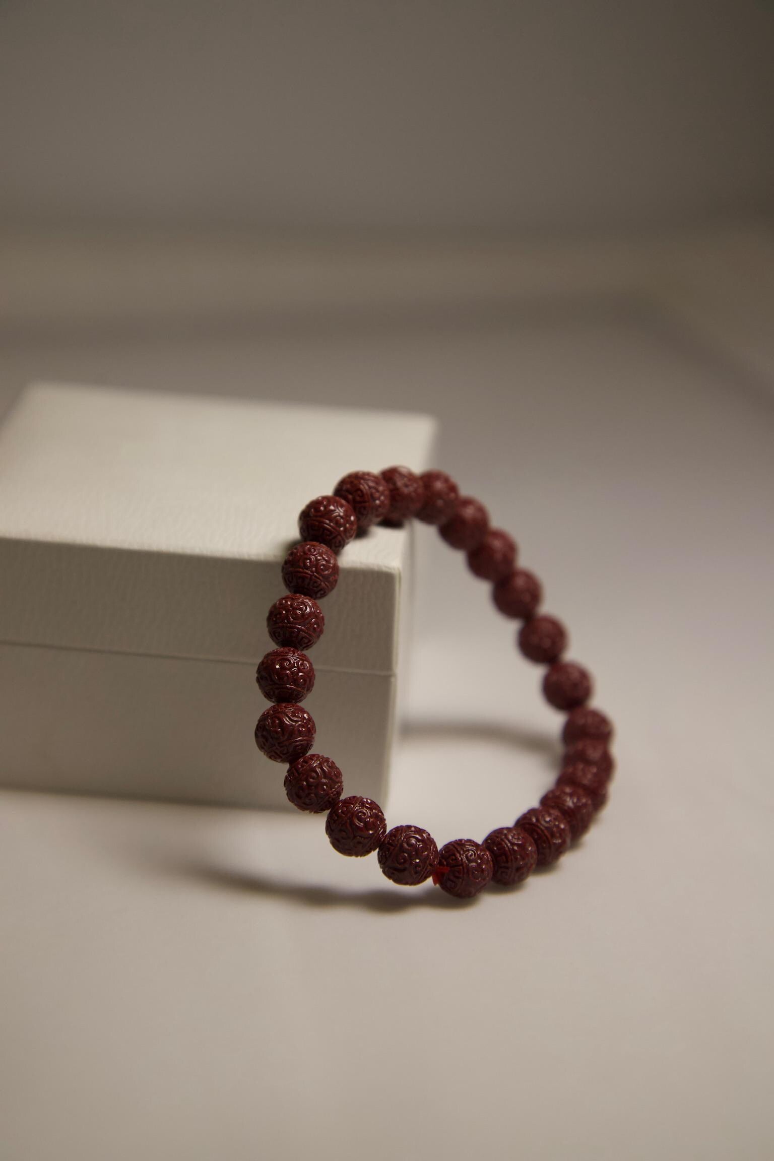 This hand-carved cinnabar bracelet captures the beauty and cultural significance of cinnabar, a gemstone admired for centuries. It features beads in a striking vermilion red, known for their adamantine or metallic luster and symbolic meaning in traditional culture.