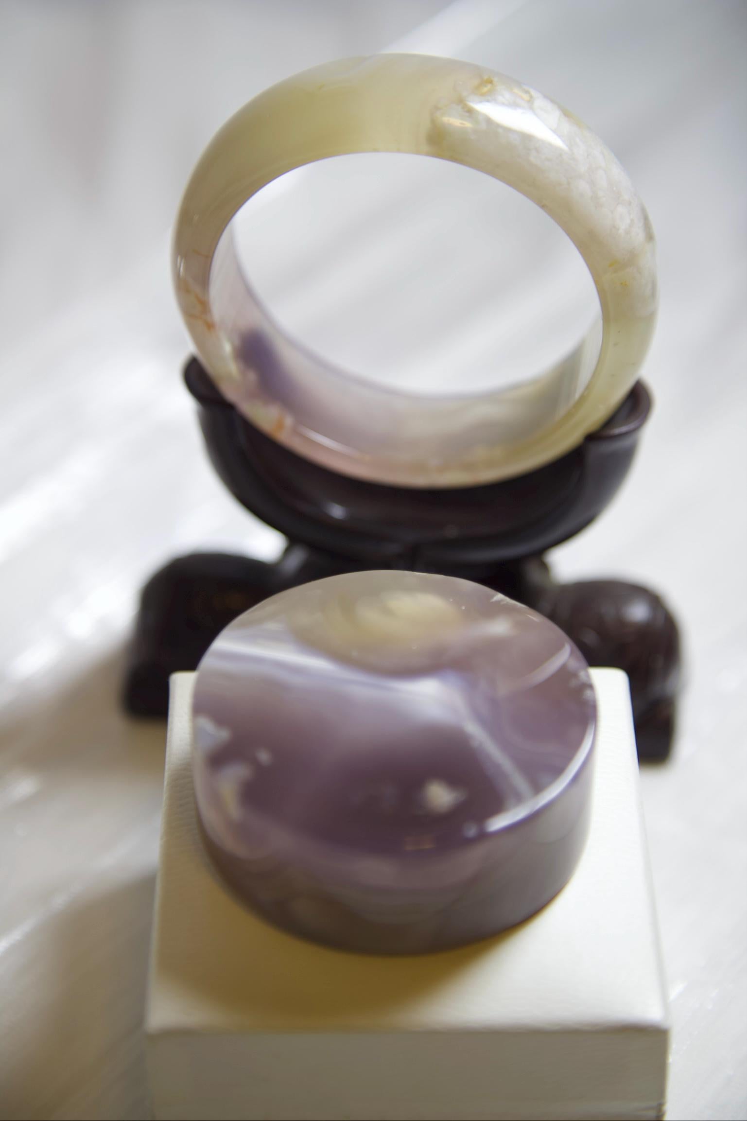 Bring the calm beauty of nature to your wrist with this natural flower agate bangle, paired with a stunning matching display stone. Featuring dreamy shades of lavender, cream, and translucent amber, this piece showcases mesmerizing floral-like inclusions—each one formed uniquely by nature.