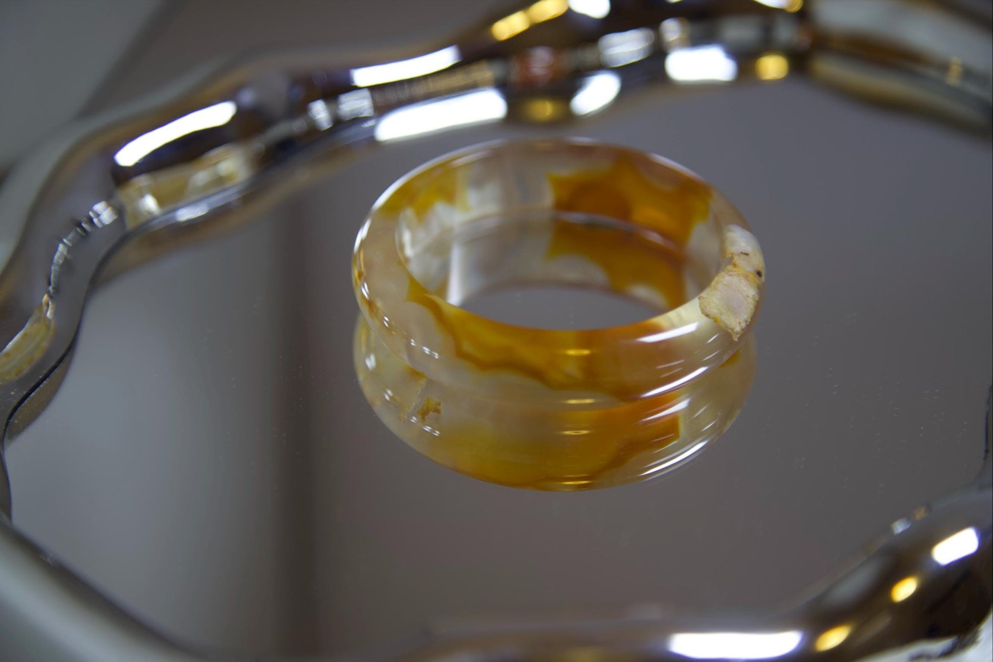 Each piece is completely one-of-a-kind, showcasing the natural flow and patterns of agate in a range of translucent yellows, creamy whites, and vibrant oranges. Slight raw textures add to its natural charm and authenticity.