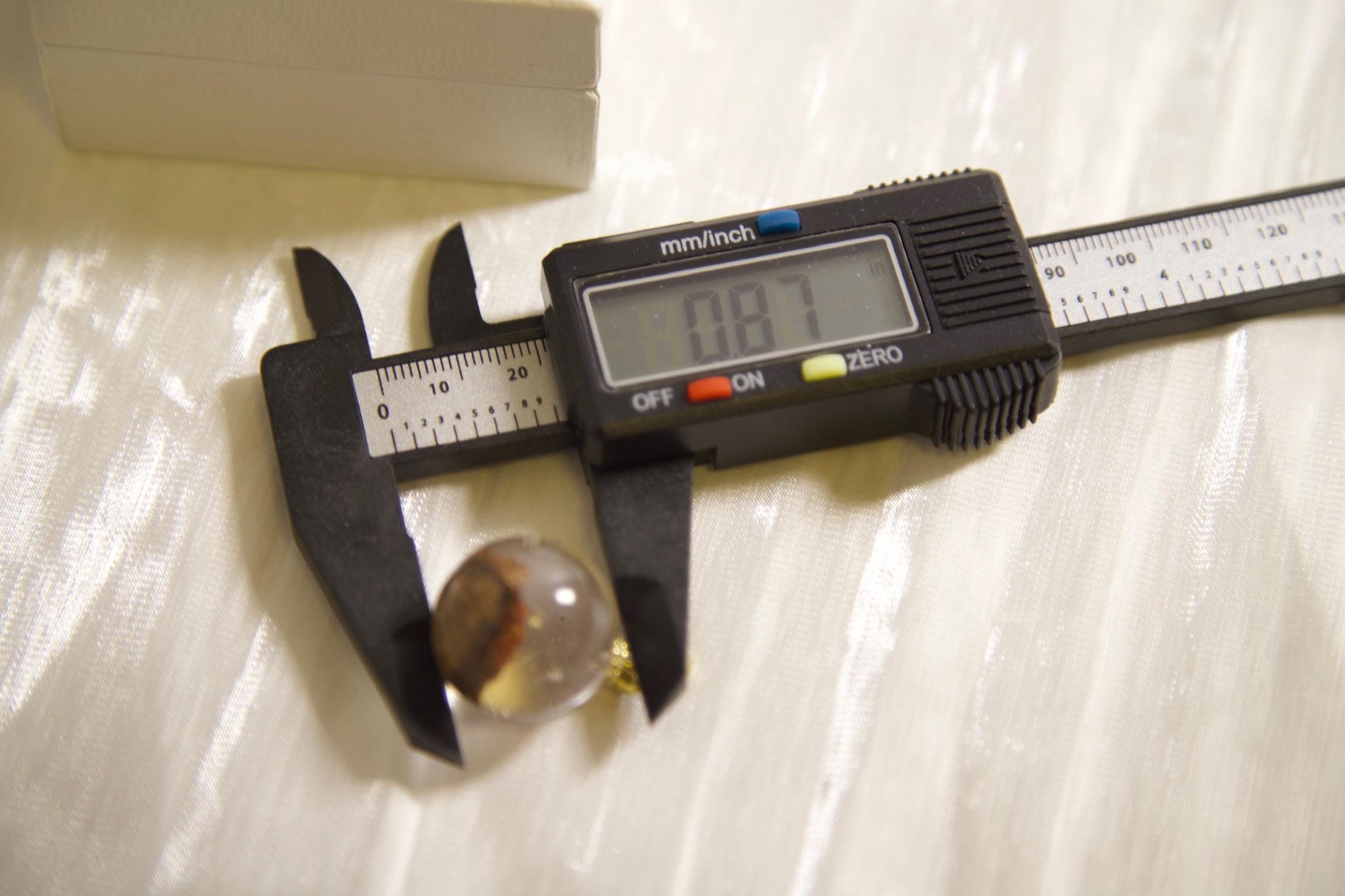 This charming pendant features a clear resin globe measuring approximately 0.87 inches (22 mm) in diameter, with natural earthy inclusions delicately suspended inside. Topped with an elegant gold-tone crown cap, this pendant combines a minimalist design with a nature-inspired aesthetic. Perfect for adding a subtle yet unique touch to any outfit.